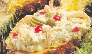 Una vez todo troceado pequeño, sazone y mezcle. Sin lavar el vaso haga la salsa rosa. Mezcle con la ensalada y rellene las dos mitades de piña, adornándolas con las gambas, las guindas, la escarola y la granada, o al gusto.