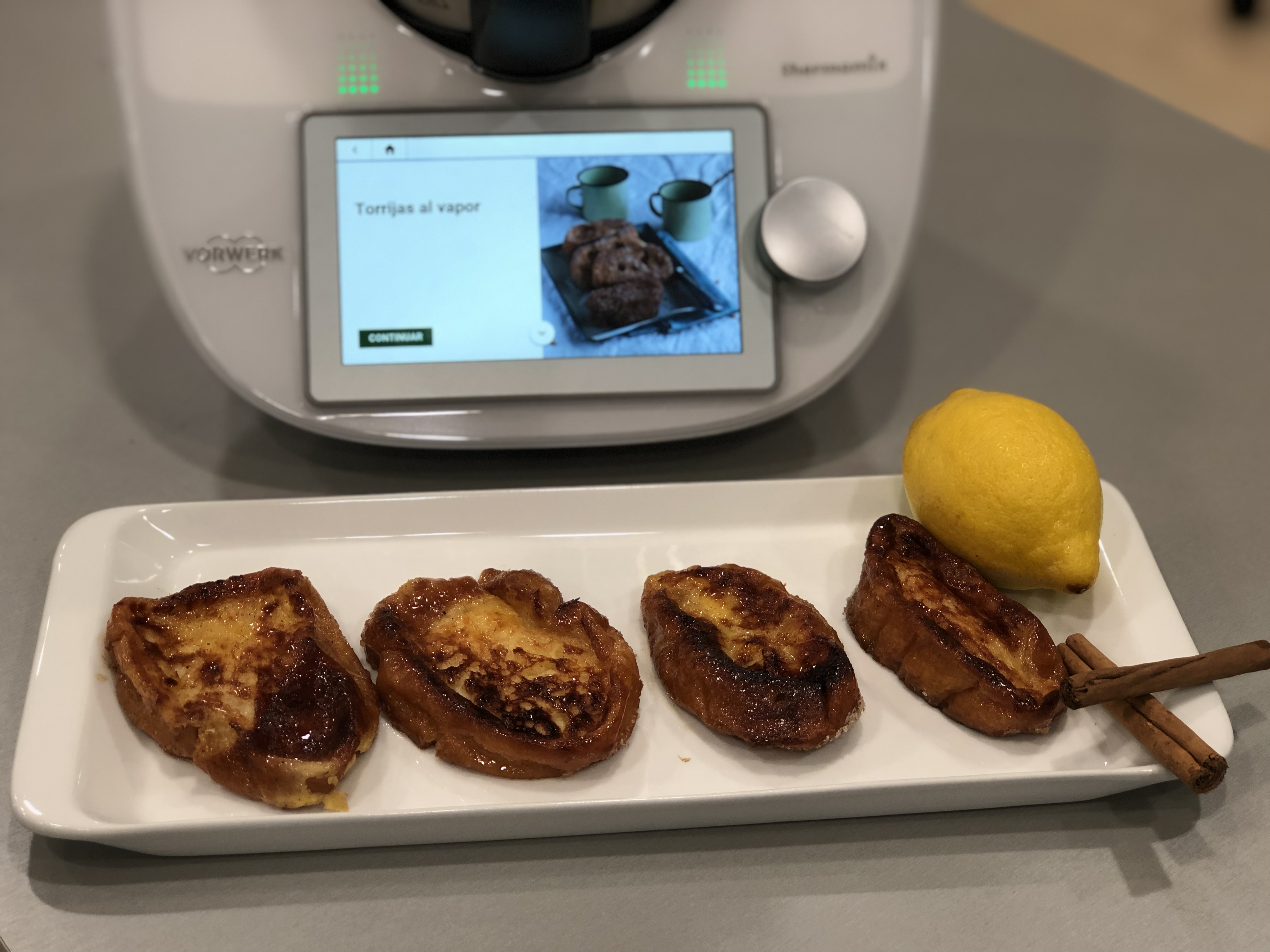 Hornee las torrijas durante 3 minutos (250ºC). Retire del horno, deje templar 5 minutos y sirva.