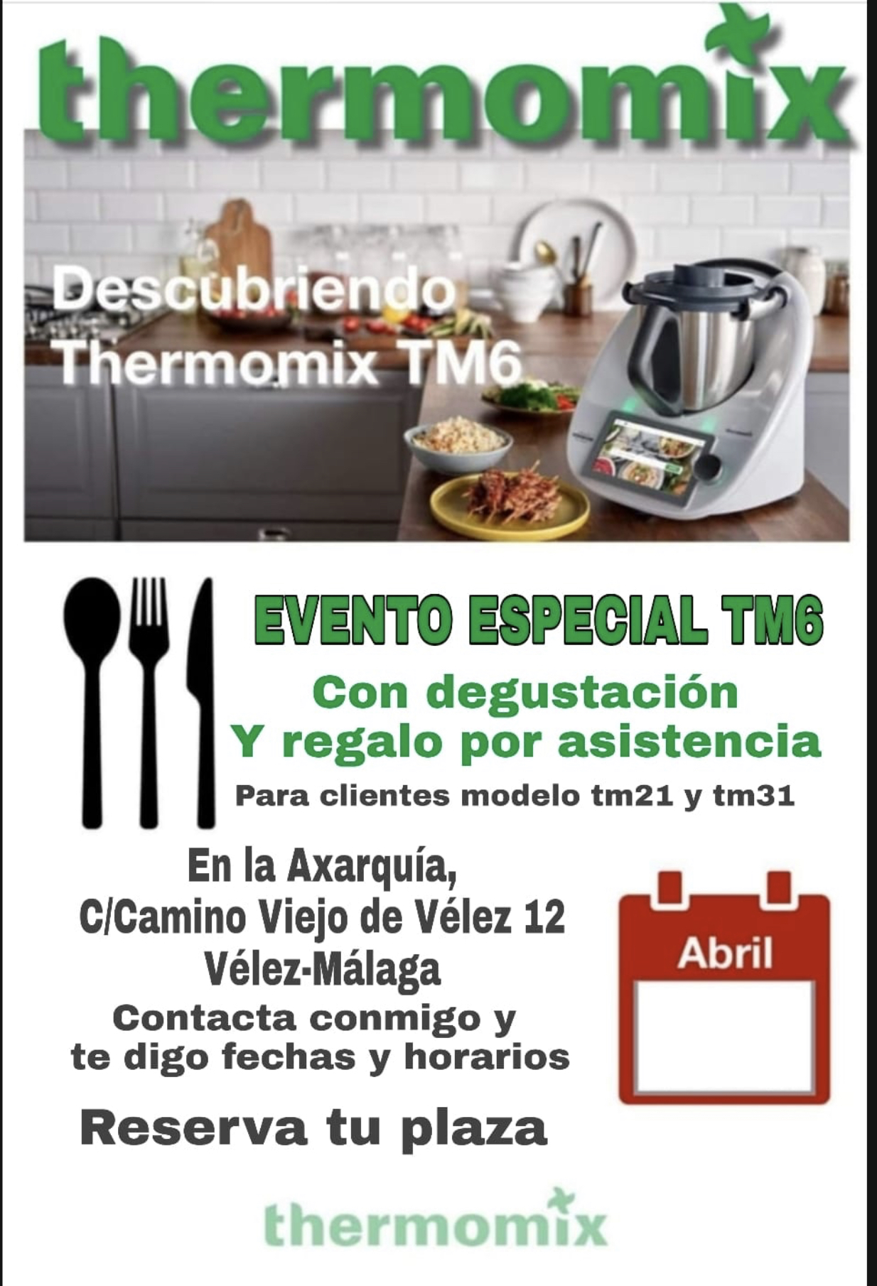 Hola, tenemos un evento especial de thermomix en la Axarquia, donde podrás degustar nuevas recetas y tendrás un regalo por tu asistencia, podrás conocer un nuevo mundo thermomix a tu alcance, solo tienes que llamarme para reservar tu plaza porque son limitadas, llámame y reserva tu plaza,
