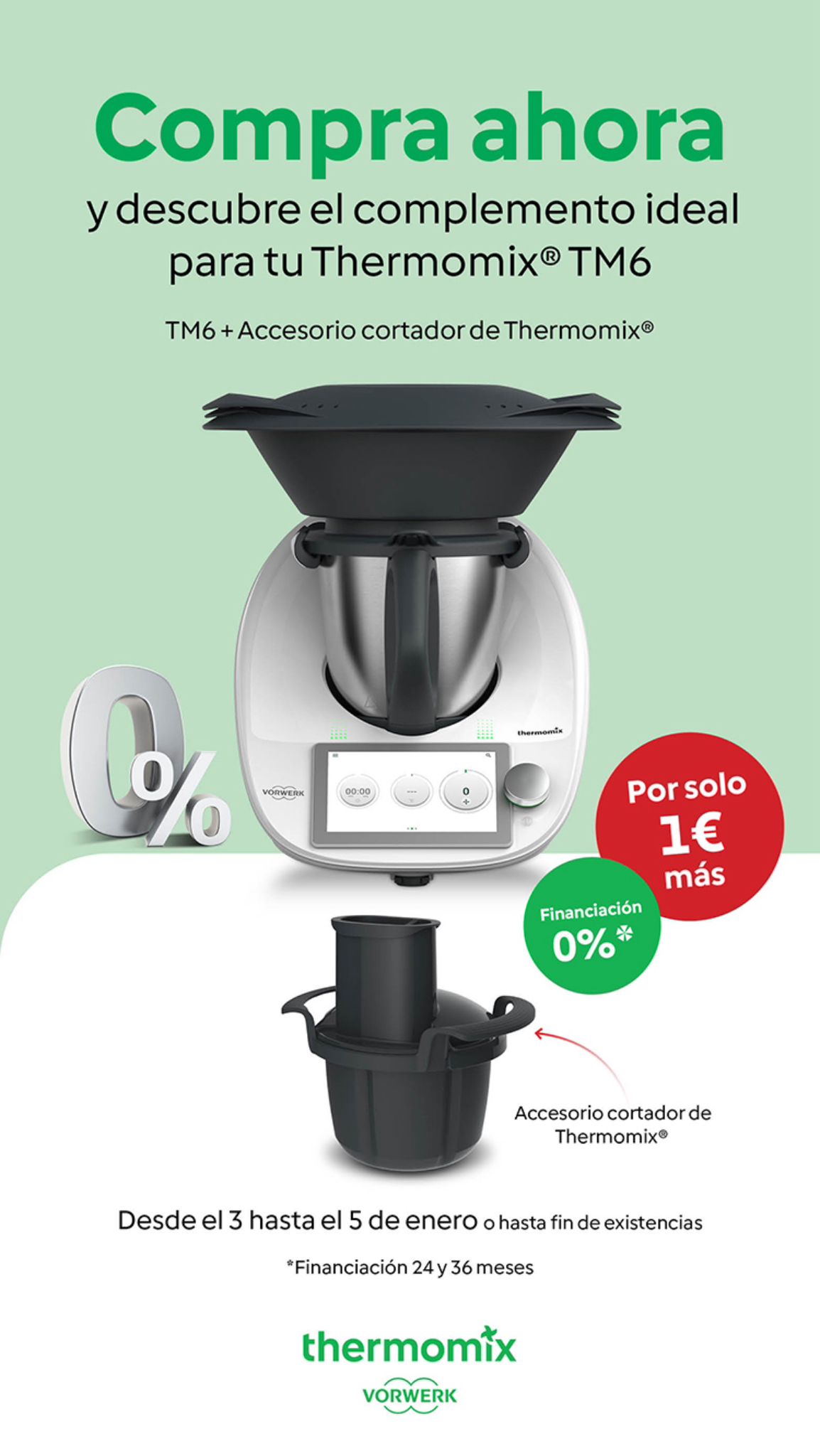Ahora Thermomix TM6 Sin intereses en cómodas cuotas: 24 meses a 57,94€/mes ó en 36 cuotas a 38,63/mes. Y además por 1 € más de regalo el cortador, ó la edición Navidad.