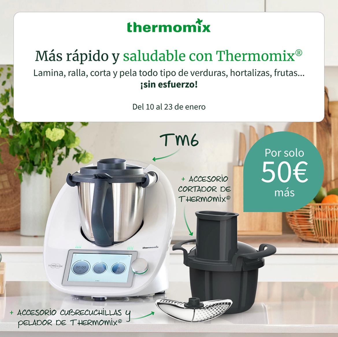 Durante unos dias ,hasta el 23 de este mes, puede ir con la compra del Thermomix TM6 junto con el cubrecuchillas pelador, por tan solo 50€.
