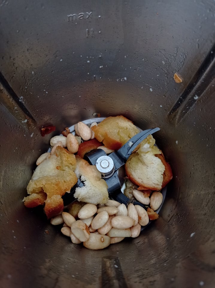 - Añadimos las almendras, los ajos, el pan y el aceite. Usando la receta de Cookidoo "Almendras fritas" , y freímos en alta temperatura.