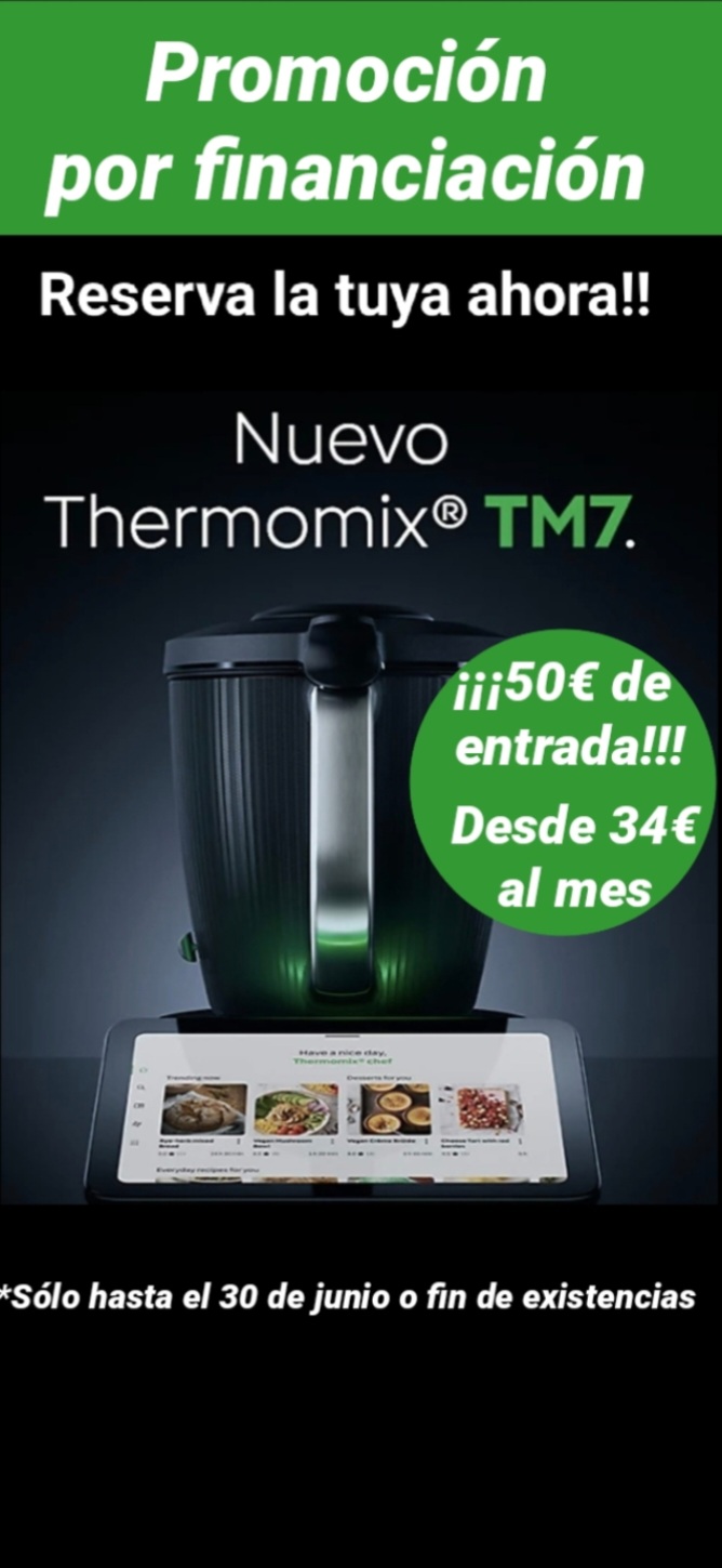 Pues ahora y sólo por unos días puedes hacer el pedido de tu Thermomix Tm7 con tan sólo 50€ de entrada y financiando el resto en cómodas cuotas desde unos 35€ al mes!!