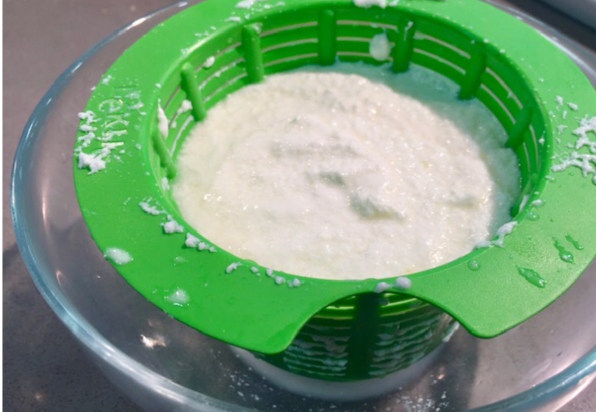 Forramos un colador o un recipiente con rejilla con una gasa. Colamos el contenido del vaso para que se escurra todo el suero y apretaremos un poco.