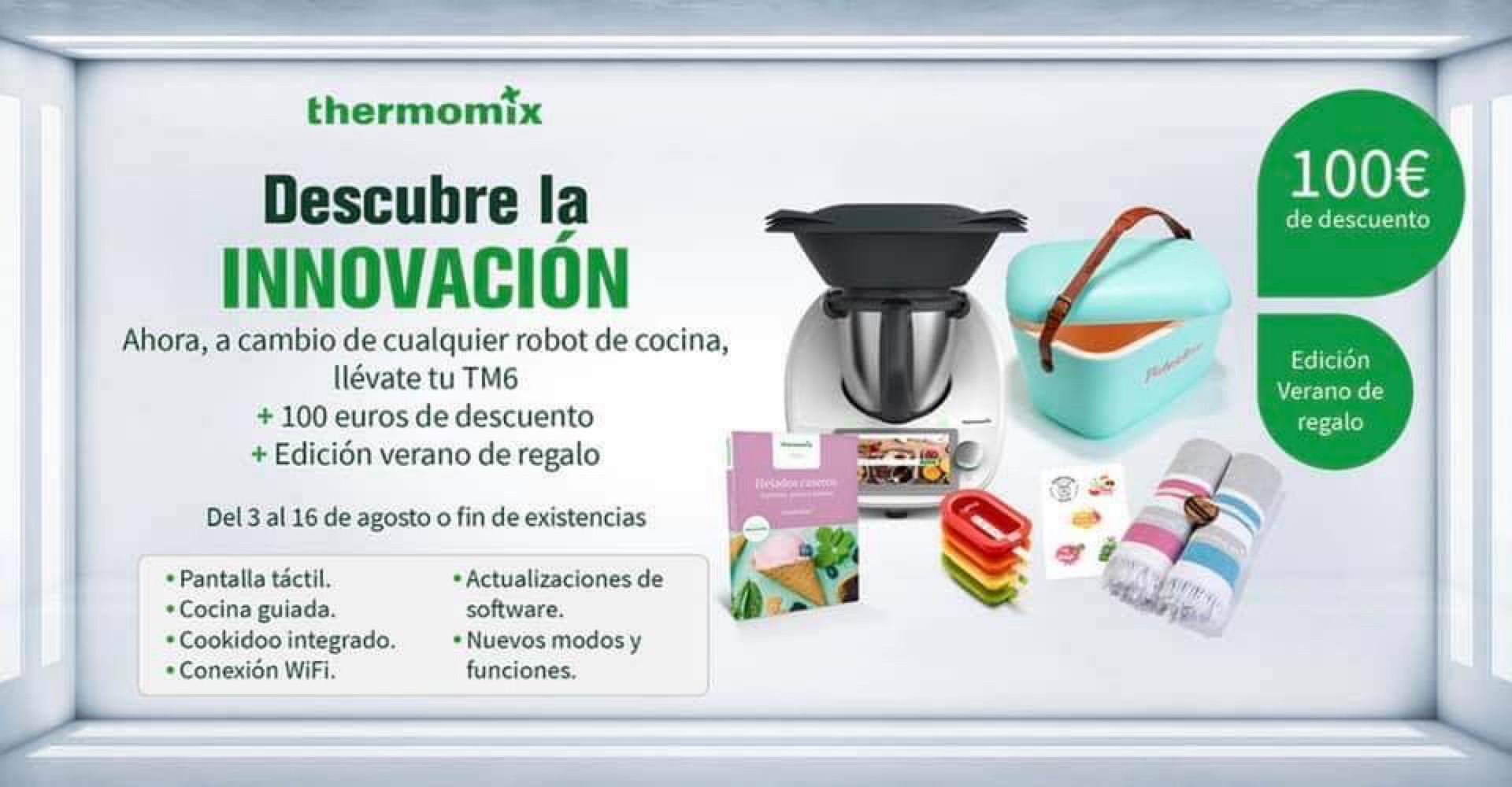 Entreganos un robot de cualquier marca y estado o un accesorio de cocina que haga alguna de las funciones y te descontamos 100€ en el precio de compra de tu THERMOMIX®️además de llevarte la Edición de verano de regalo.