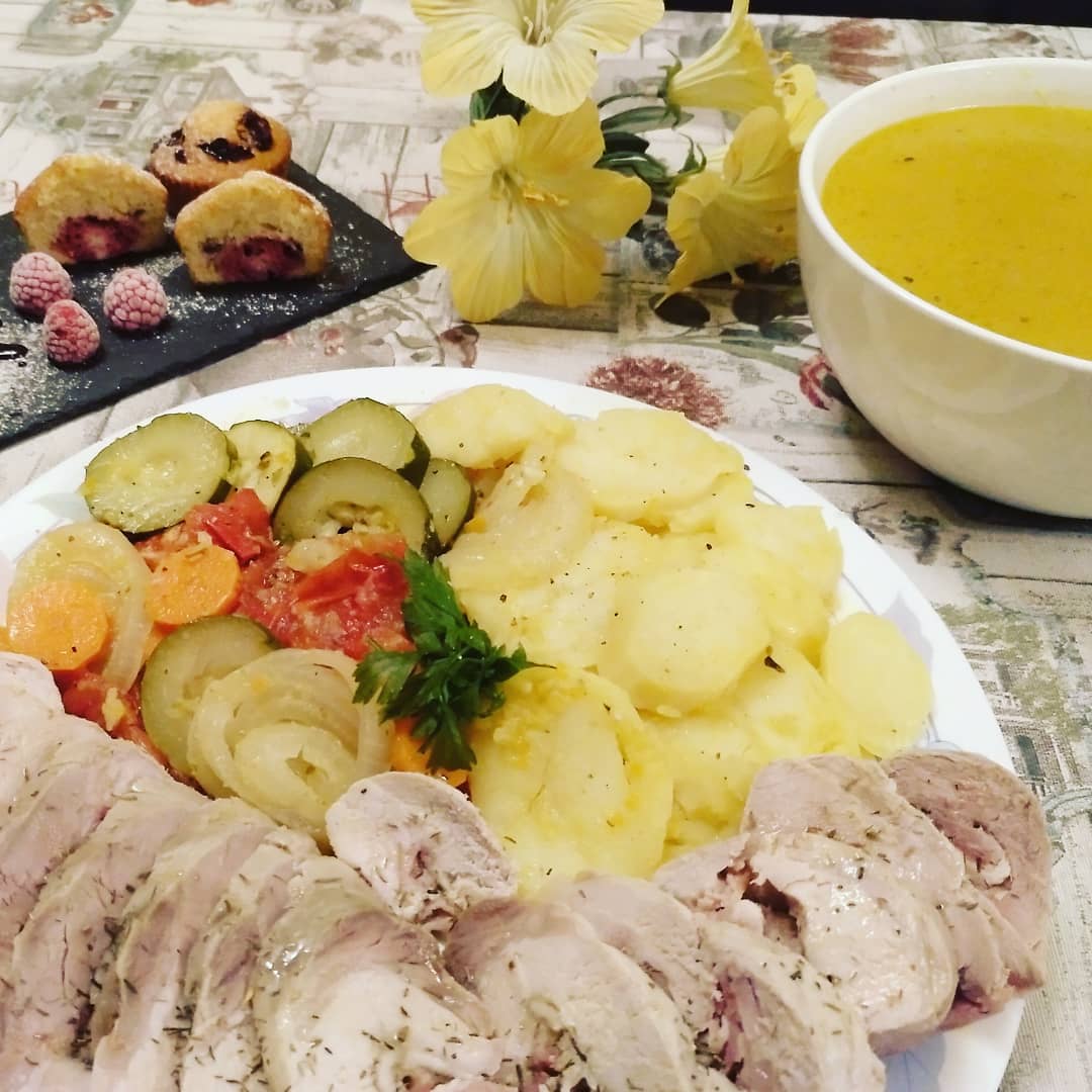 Sirva la sopa de entrante. Tras servir la sopa, retire el film transparente del rollo de carne, corte en rodajas, colóquelas en la fuente junto con las verduras y sirva de plato principal. Desmolde los pudins sobre platos y sirva de postre.